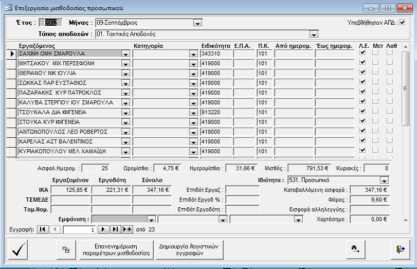 Στην οθόνη αυτή γίνεται η καταχώρηση ή η επεξεργασία της μισθοδοσίας του προσωπικού.