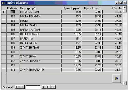 ArgusΛογιστικήΑσφαλιστικάΠαράμετροιΑσφαλιστικά δεδομένα Πακέτα κάλυψης Πακέτα κάλυψης Στην οθόνη αυτή εμφανίζονται τα πακέτα κάλυψης όπως αναφέρονται στους πίνακες του ΙΚΑ.