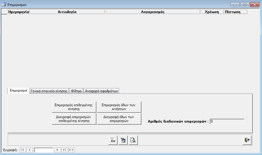 Από την οθόνη αυτή εκτελούνται οι επιμερισμοί ποσών των λογαριασμών στην Αναλυτική Λογιστική.