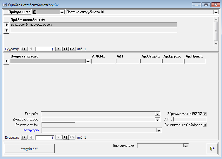 - Εταιρεία. Αν πρόκειται για εκπαιδευτή πρακτικής εταιρείας, συμπληρώνουμε την εταιρεία από την οποία προέρχεται. Το στοιχείο συμπληρώνεται με ανεύρεση από τις εταιρείες που έχουν δηλωθεί στην ομάδα εταιρειών του προγράμματος.