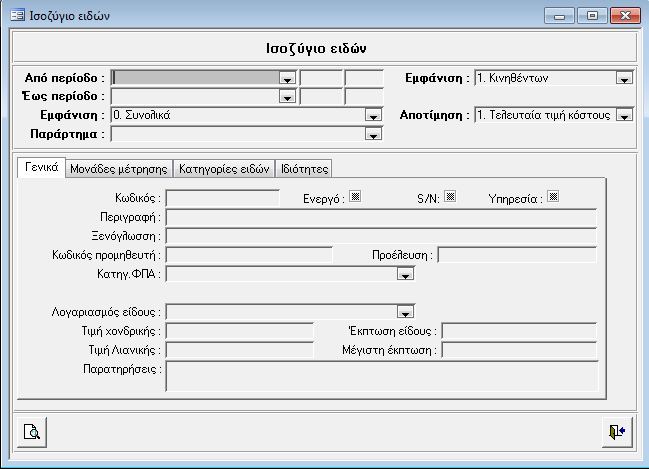 - Αποτίμηση (τιμή με την οποία θα γίνει Αποτίμηση Υπολοίπου. Οι διαθέσιμες επιλογές είναι: τελευταία τιμή κόστους - μέση τιμή κόστους - μέση σταθμική τιμή κόστους - τιμή κόστους LIFO - τιμή κόστους FIFO)
