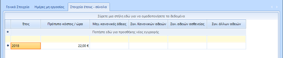 Μπορούμε για κάθε έτος, να καταχωρήσουμε το «Πρότυπο κόστος / ώρα» που θα χρησιμοποιηθεί για τον υπολογισμό κόστους. Στη σελίδα αυτή το σύστημα προβάλει αυτόματα τα σύνολα απουσίας ξεχωριστά για κάθε κατηγορία απουσίας.
