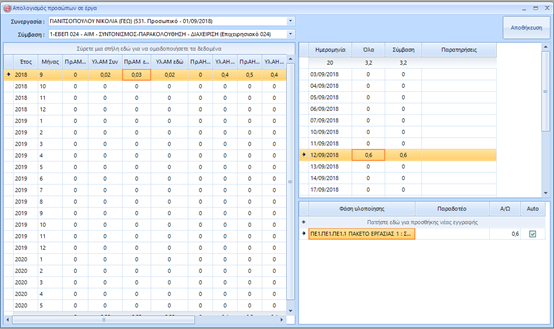 Στην πάνω δεξιά πλευρά της φόρμας, το σύστημα προβάλει για την επιλεγμένη περίοδο τις διαθέσιμες ημέρες εργασίας. Για κάθε ημέρα προβάλει τις ήδη προγραμματισμένες ώρες για αυτή τη σύμβαση και για όλες τις συμβάσεις αθροιστικά για να έχουμε εποπτεία.