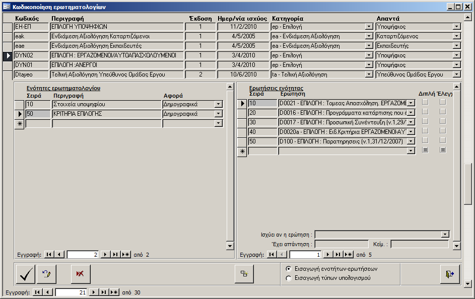 - Διπλή: Αν το πεδίο είναι τσεκαρισμένο, τότε στην οθόνη απαντήσεων απαιτείται από την εφαρμογή να καταχωρηθεί δύο (2) φορές η απάντηση για αυτή την ερώτηση, και ελέγχεται ότι και τις δύο φορές δόθηκε η ίδια απάντηση (π.χ. ένας τέτοιος έλεγχος θα μπορούσε να απαιτείται στο πεδίο ΑΦΜ του καταρτιζόμενου για να είναι σίγουρο ότι δεν έγινε κάποιο λάθος κατά την πληκτρολόγηση).
