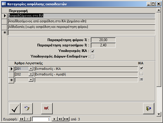 Στην οθόνη αυτή συμπληρώνουμε τις κατηγορίες ασφάλισης των εκπαιδευτών. Για κάθε κατηγορία συμπληρώνουμε: