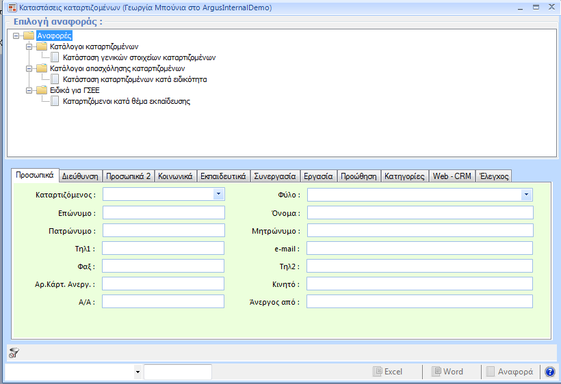 Οι «Καταστάσεις» εκπαιδευομένων αφορούν καταλόγους οι οποίοι υπακούν στα φίλτρα που έχει ορίσει ο χρήστης. Mε χρήση των φίλτρων αυτών, μπορούμε να προβάλλουμε ή να εκτυπώσουμε μια ποικιλία καταστάσεων στοιχείων καταρτιζομένων