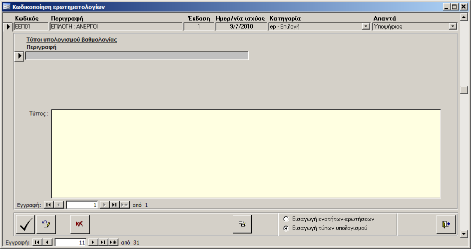Στον παραπάνω τύπο υπολογισμού ανέργων, υπολογίζεται ο συνολικός βαθμός κάθε υποψηφίου ως άθροισμα της βαθμολογίας των κριτηρίων που κωδικοποιήθηκαν με τις ερωτήσεις ΕΠΟ2 & ΕΠΟ3.